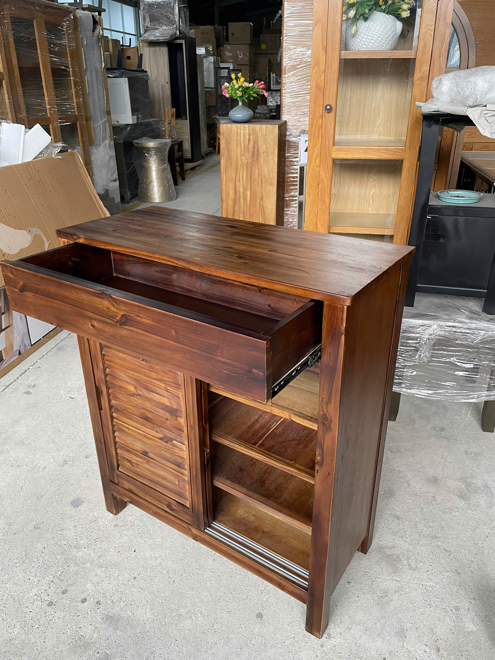Với kích thước Dài 85 x Rộng 38 x Cao 100cm, tủ có sức chứa lớn nhưng vẫn tiết kiệm diện tích, phù hợp cho lối vào, hành lang hoặc phòng khách. Hai cánh cửa lùa giúp mở tủ dễ dàng mà không tốn không gian, trong khi ngăn kéo phía trên tiện lợi cho việc cất giữ chìa khóa, tất, hay các vật dụng nhỏ hàng ngày.