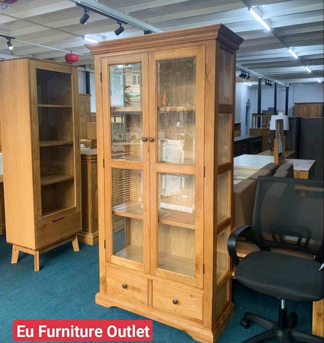 Điểm nhấn của tủ nằm ở phần đỉnh chỉ và chân đế được thiết kế độc đáo, mang lại tổng thể hài hòa giữa nét cổ điển và hiện đại. Kiểu dáng cao ráo, thanh thoát giúp tủ trở thành tâm điểm thu hút trong phòng khách, phòng ăn hoặc không gian trưng bày.